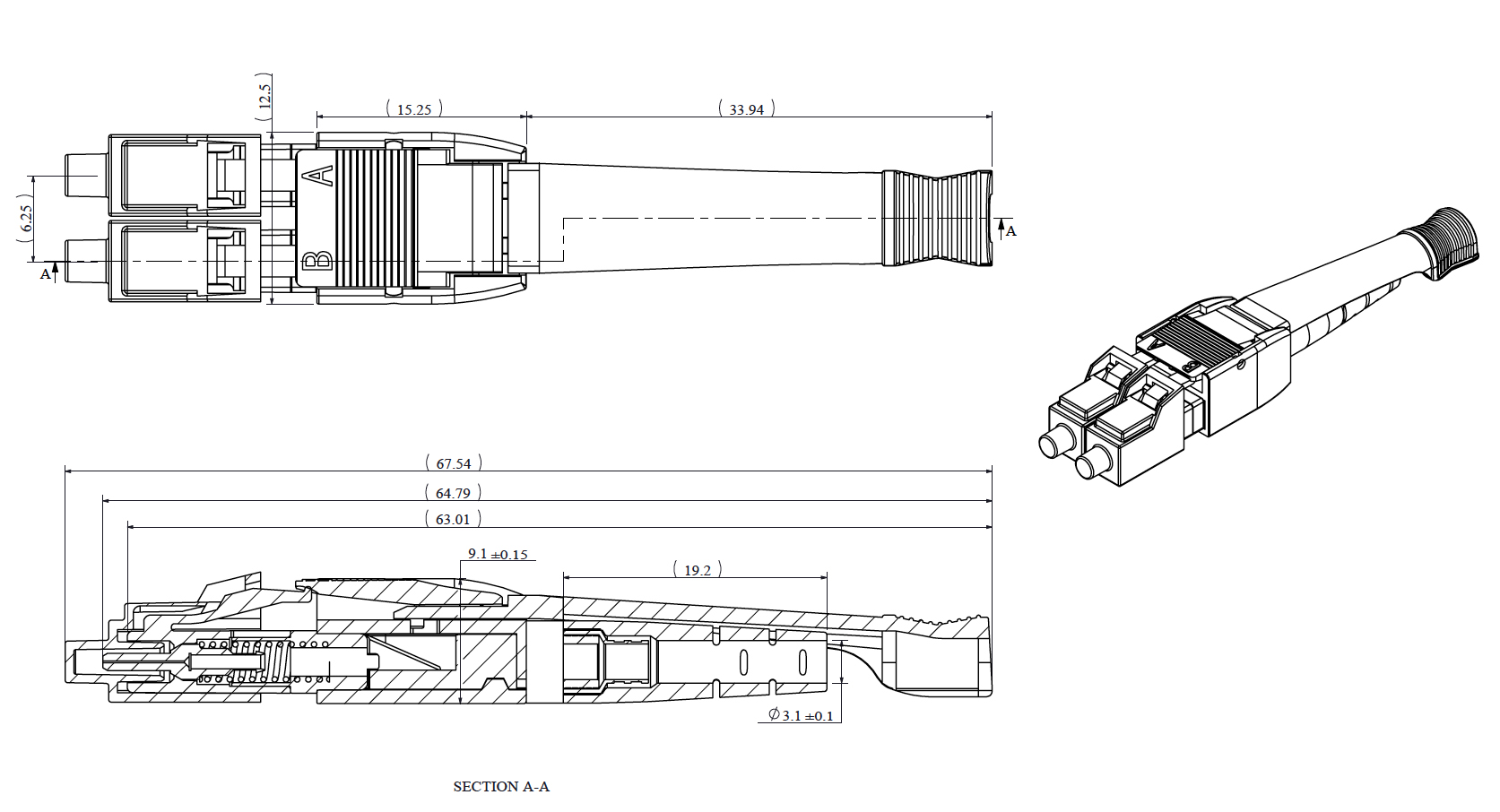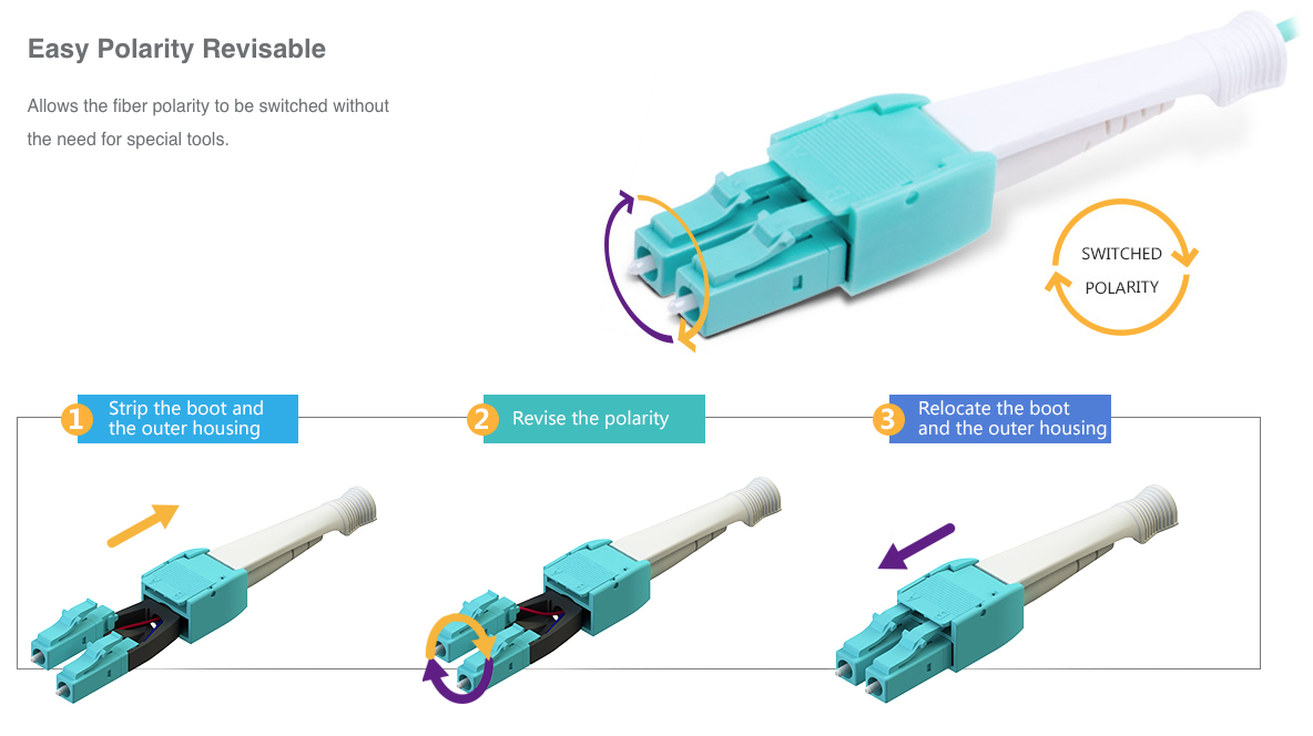 | Особенность конструкции | круглый дуплексный кабель в оболочке 2,0 мм (два волокна в одной оболочке); дуплексные LC коннекторы с одним хвостовиком (Uniboot) |