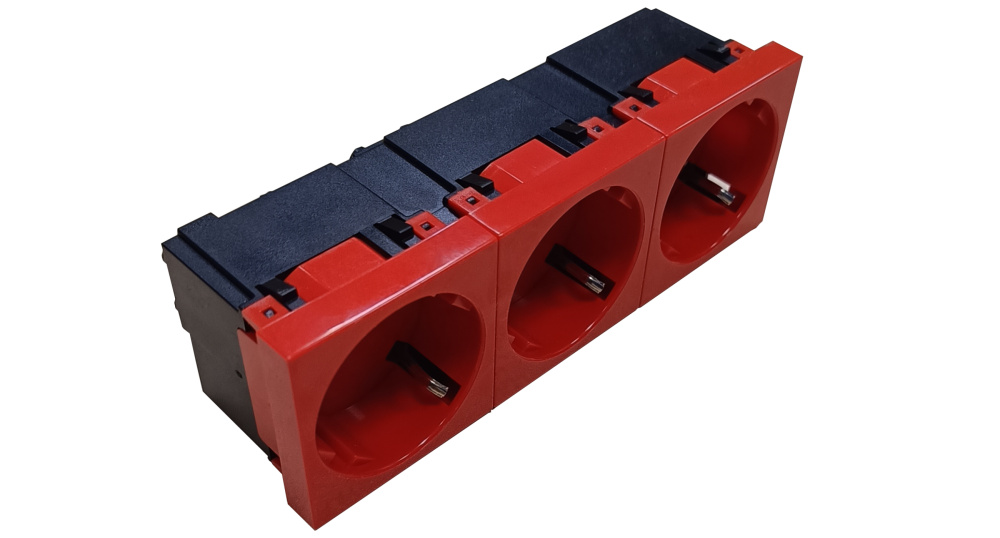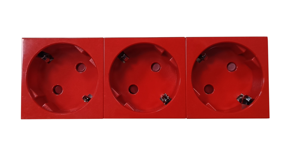 Розетка тройная 3 × 2P+E немецкий стандарт, с защитными шторками, с безвинтовым зажимом, 45 градусов, красный