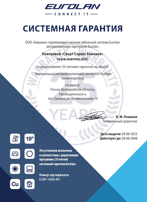 Eurolan гарантирует, что СКС Eurolan, установленная Авторизованным Партнером, сохраняет требуемые характеристики в течение всего гарантийного срока.